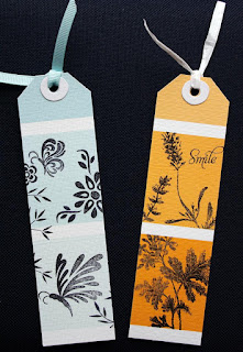 The strips were cut in half and trimmed at the top. The protectors around the hole - I cannot for the life of me remember what they are called - come from the Magnolia Romantic tag die. The blue bookmark has images from an old Hero Arts stamp set and the orange one was stamped using Flourishes Fine Herbs stamp set. The sentiment is also a Flourishes one from the set called Tag Lines.